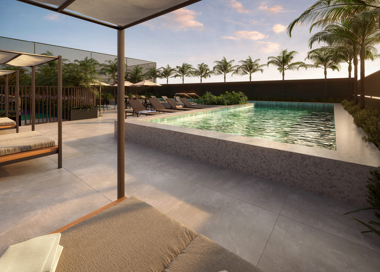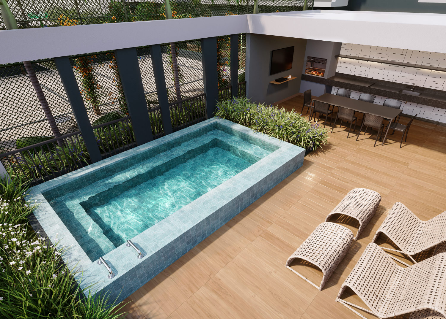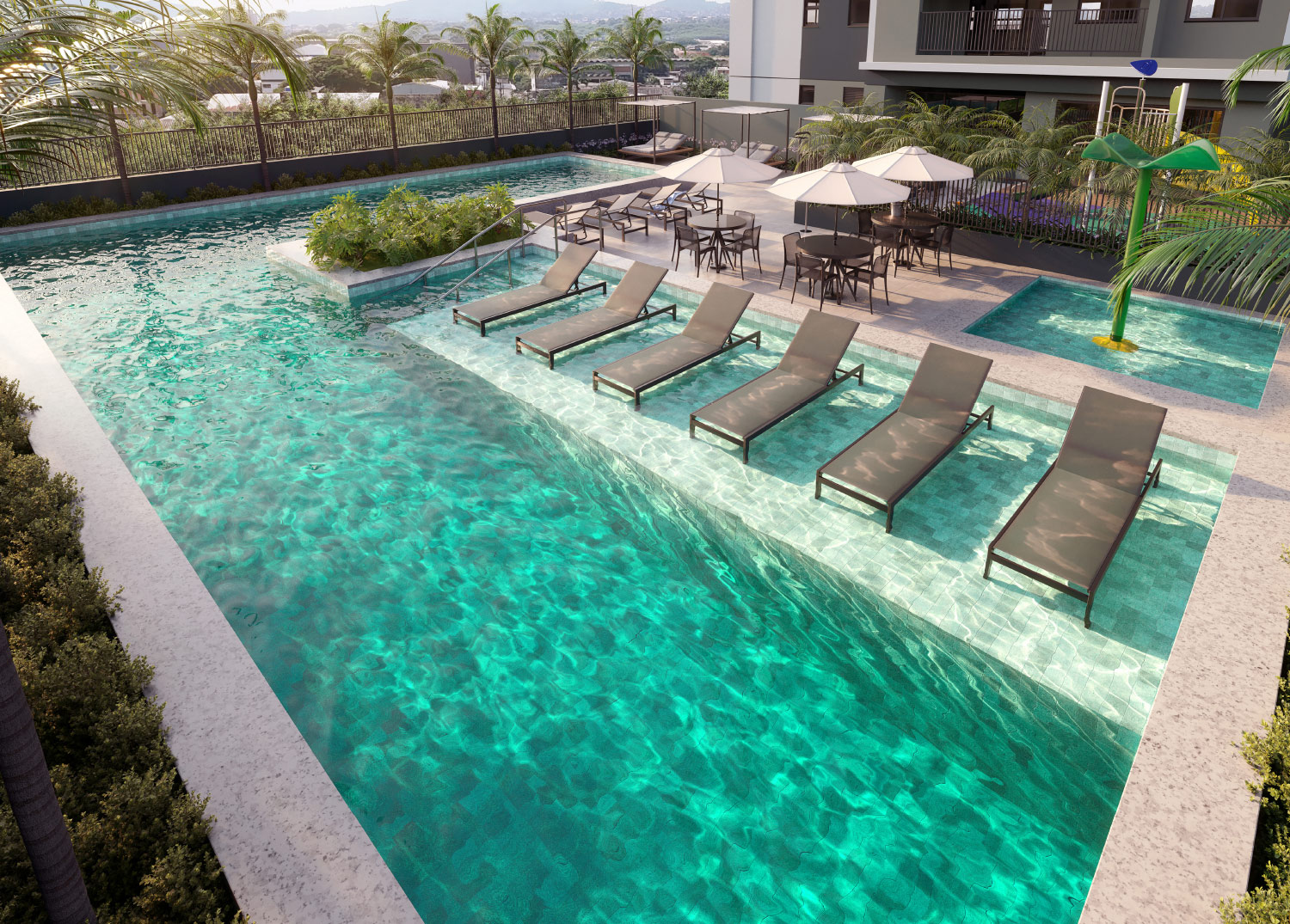 Perspectiva artística da Piscina Adulto e Infantil com Solarium